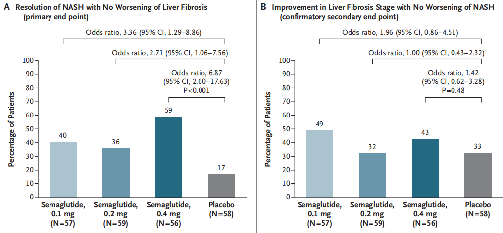 早在2016年11月,诺和诺德就启动了司美格鲁肽治疗NASH的II期临床试验(NCT02970942)。该研究为一项随机、双盲、安慰剂对照的II期临床,共纳入了320名伴有肝纤维化(F1~F3)的NASH患者,随机按1:1:1:1接受司美格鲁肽0.1mg、0.2mg、0.4mg(每日一次皮下注射)或安慰剂治疗72周。主要终点为NASH改善且纤维化无恶化的患者比例,次要终点为纤维化改善且NASH无恶化的患者比例,终点数据分析仅在F2~F3期纤维化患者中进行。