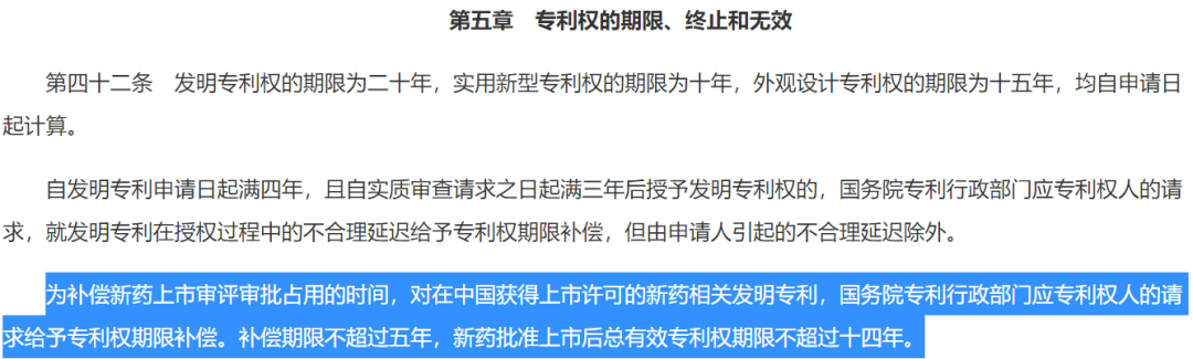 《中华人民共和国专利法(2020年修正)》第五章第四十二条明确规定:为补偿新药上市审评审批占用的时间,对在中国获得上市许可的新药相关发明专利,国务院专利行政部门应专利权人的请求给予专利权期限补偿。补偿期限不超过5年,新药批准上市后总有效专利权期限不超过14年。