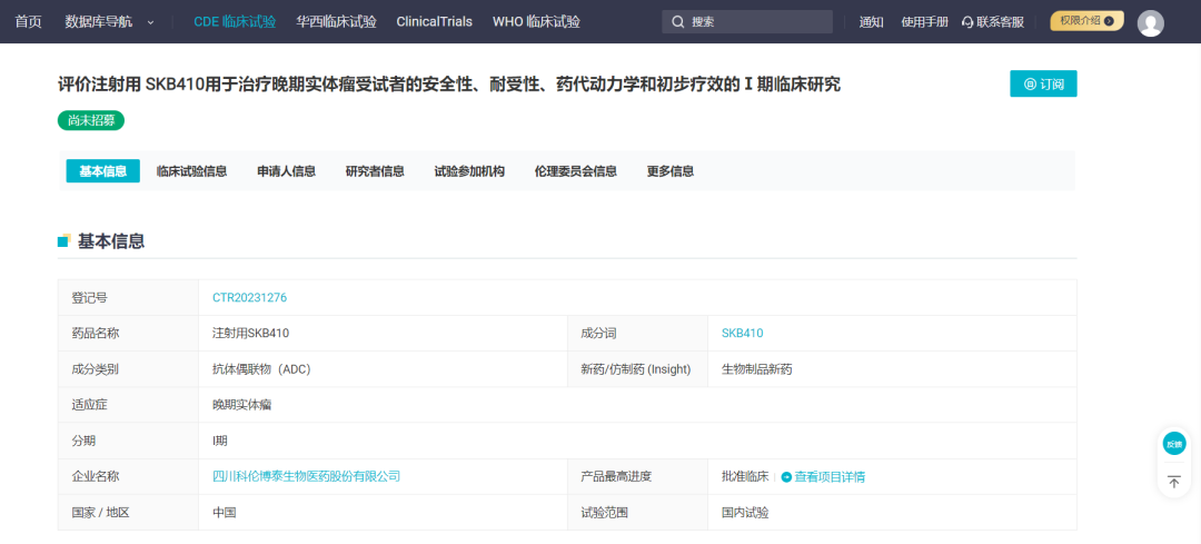 这是 SKB410 的首个临床试验,标志着这一项目正式进入了临床阶段,这也是科伦启动临床的第 4 个 ADC 项目。