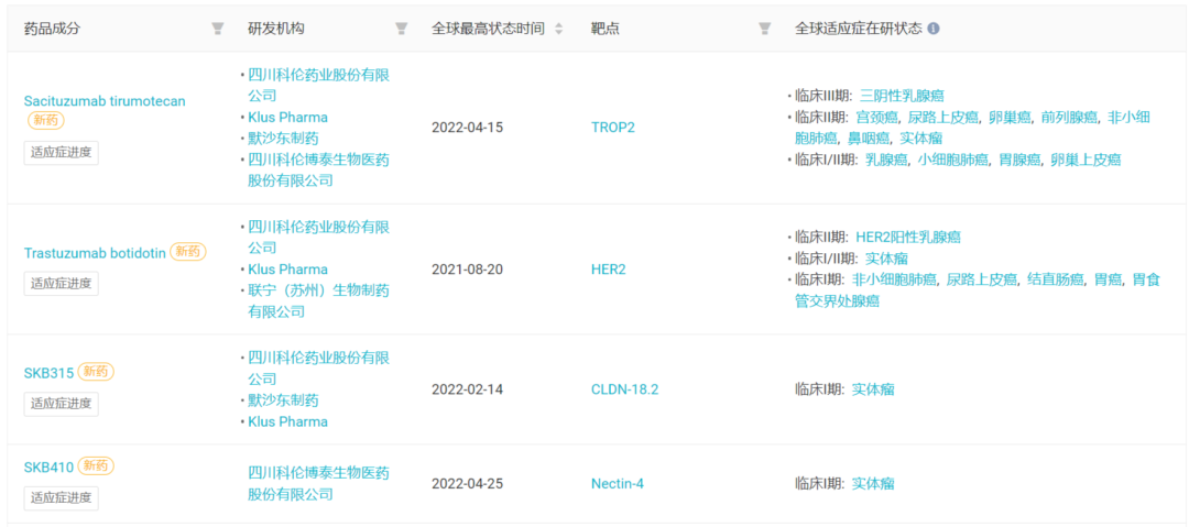 科伦 4 款已披露 ADC 药物适应症研发进展