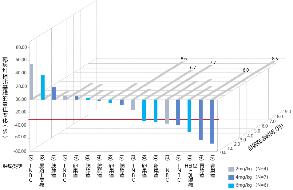SKB264 的早期临床研究结果显示了在转移性实体瘤患者中良好的耐受性、安全性和令人鼓舞的抗肿瘤活性,在 TNBC 和卵巢癌中的疗效数据尤为亮眼。根据最初在 CSCO 发布的数据,17 例既往经历多线治疗的实体瘤患者接受了至少一次疗效评估,总缓解率(ORR)为 41.2%(7/17),疾病控制率(DCR)为 70.6%(12/17)。其中 5 例 TNBC 患者中有 2 例 PR(ORR 为 40%),其他瘤种中也获得了较好的疗效反应。