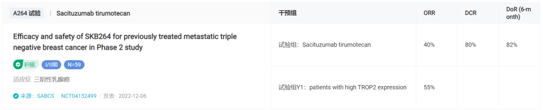 2022 SABCS 中,科伦又发布了新的 II 期临床数据,在 59 例患者中实现了 40% 的 ORR,其中 TROP2 高表达亚组 ORR 达到 55%。