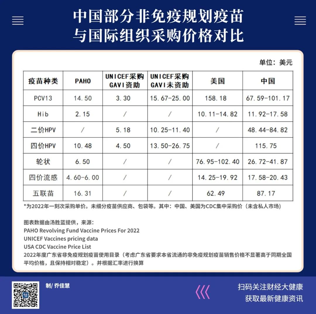 从2022年最新数据看,中国部分非免疫规划疫苗与国际组织泛美卫生组织(PAHO)的价格水平差距较大。比如,四价HPV疫苗,PAHO采购价约为10.48美元,中国的采购价约为111.75美元,高出10倍多。