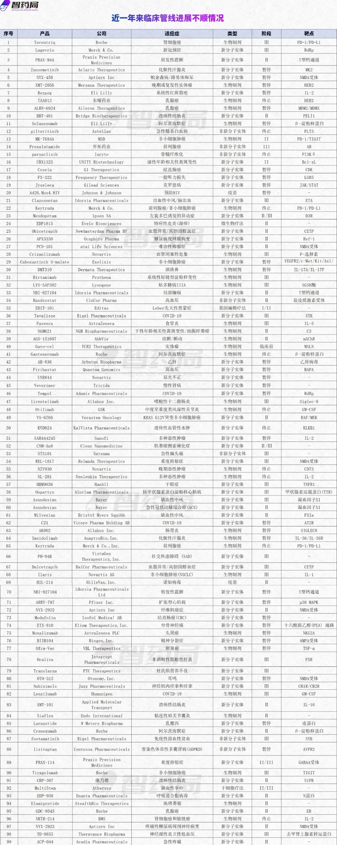 智药局为此梳理了近一年以来99条临床进展不及预期的管线(不完全统计),尝试从中得出一些自己的看法,希望能为业内人士带来帮助。