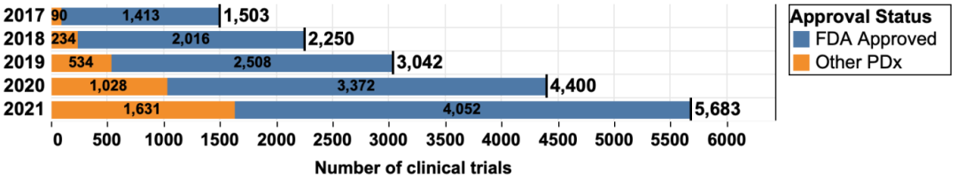 图:2017-2021年PD1/PDL1抗体临床试验增长情况