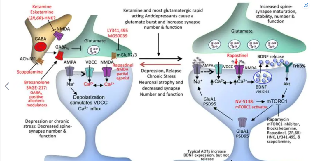 图:速效抗抑郁药的初始细胞靶位点和随后的突触变化
