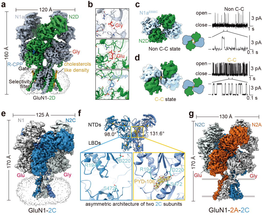 图:含有GluN2D和GluN2C受体的三维结构、门控机制和药理学特性。