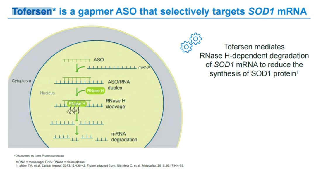 2018年,Biogen从Ionis获得Tofersen的授权,Tofersen是一种针对SOD1基因突变的ASO疗法,通过创建的片段,与SOD1 mRNA特异性结合,从而阻止 SOD1 蛋白的产生,旨在减缓ALS的疾病进展。