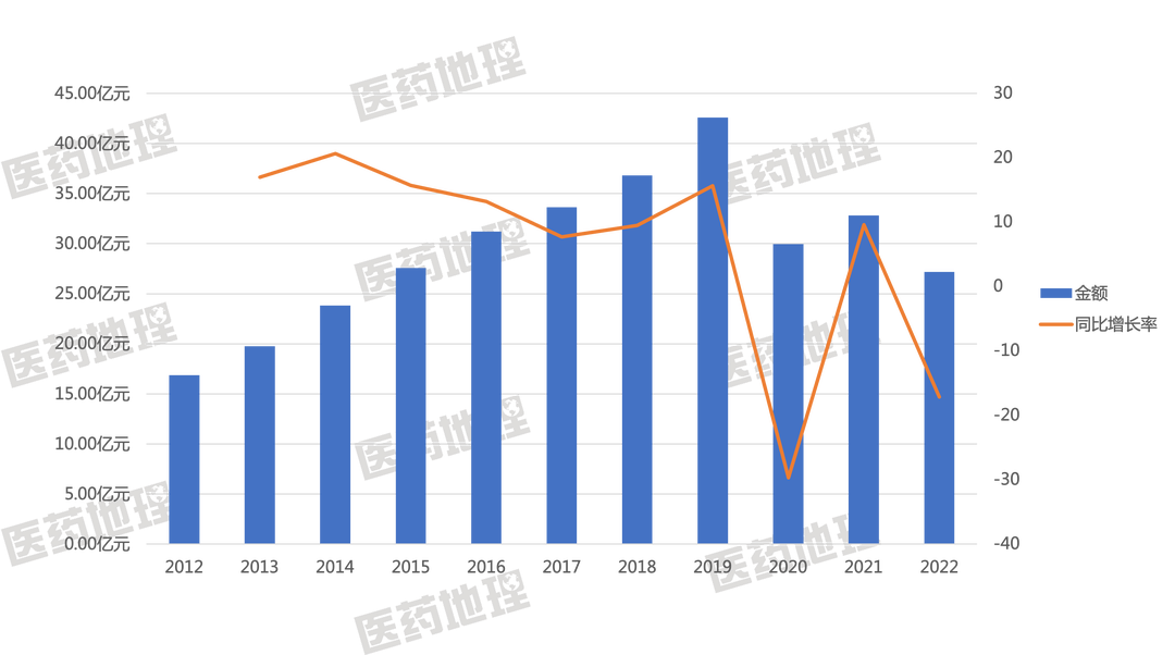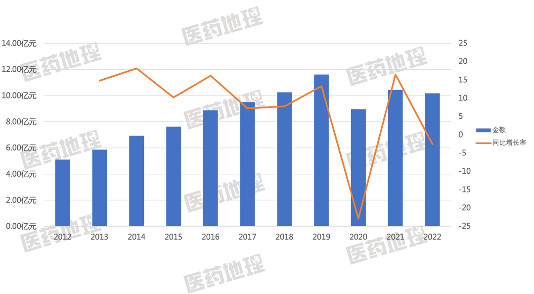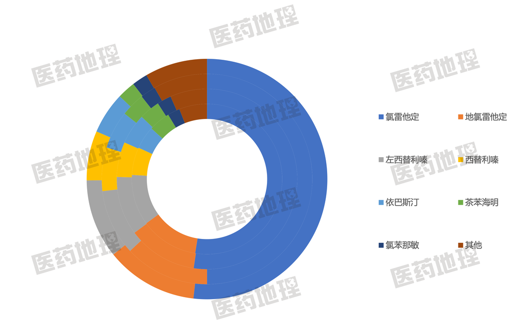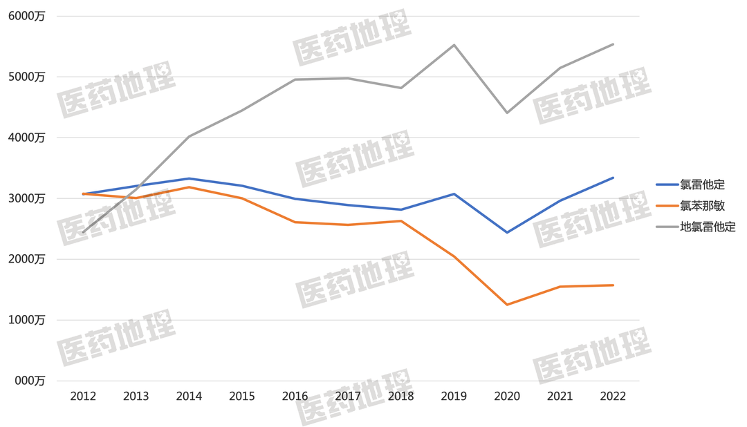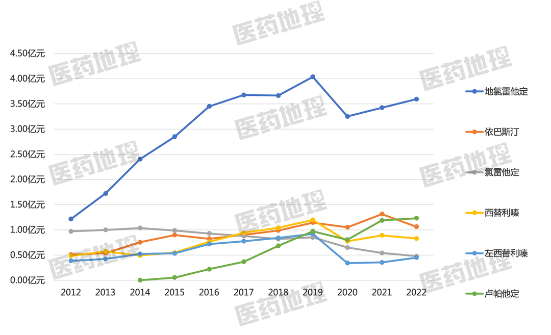 图4:抗组胺药近十年样本医院市场销售额 数据来源:PDB药物综合数据库样本医院用药