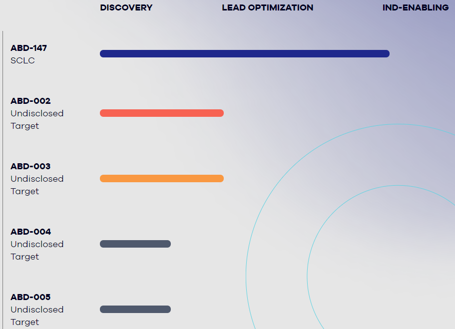 Abdera的领先项目靶向δ样配体3(DLL3),这是Notch通路中的一种蛋白质,在小细胞肺癌(SCLC)和其他实体瘤中上调并特异表达,在非恶性细胞上很少表达。该公司的DLL3项目正在推进临床前开发,Abdera预计将于2024年向FDA提交一份IND申请。此外,Abdera正在推进针对其他未公开的癌症靶点的强大管线。