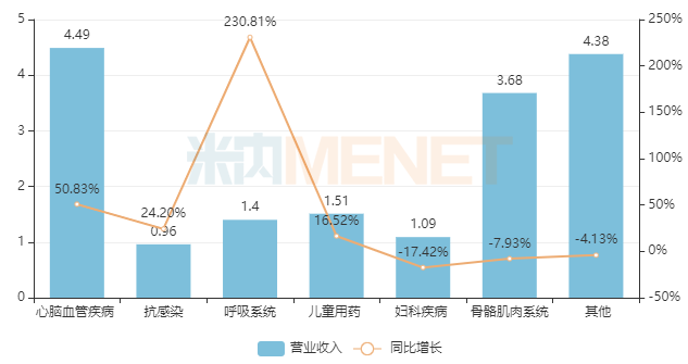 济川药业产品线主要围绕清热解毒、儿科、消化等治疗领域。在独家品种小儿豉翘清热颗粒销售收入上升拉动下,公司儿科类产品收入同比增长42.62%。米内网数据显示,在中国城市公立医院、县级公立医院、城市社区中心以及乡镇卫生院(简称中国公立医疗机构)终端儿科中成药产品排名中,小儿豉翘清热颗粒多年来稳居首位。