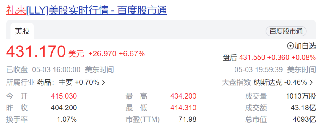 受此利好消息影响,礼来股价随之上涨,目前市值已达到4093亿美元,这一市值已成为纯药企市值第一,距离强生的4200亿美元市值已相差无几。