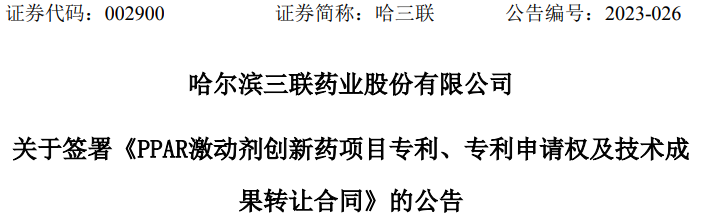 近日,哈尔滨三联药业与中国药科大学签署《PPAR激动剂创新药项目专利、专利申请权及技术成果转让合同》,中国药科大学将其研发的PPAR(过氧化物酶体增殖物激活受体)激动剂的相关专利权、专利申请权以及技术成果转让给哈三联,哈三联进而进行全球范围内的独占性开发、生产和商业化。