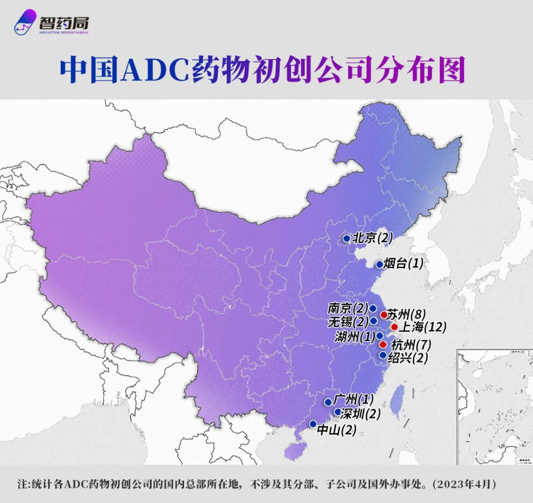 俯瞰整个中国地图,ADC药物初创企业分布呈现极不均衡的特点,主要在科研资源丰富或者产业集群的地带。