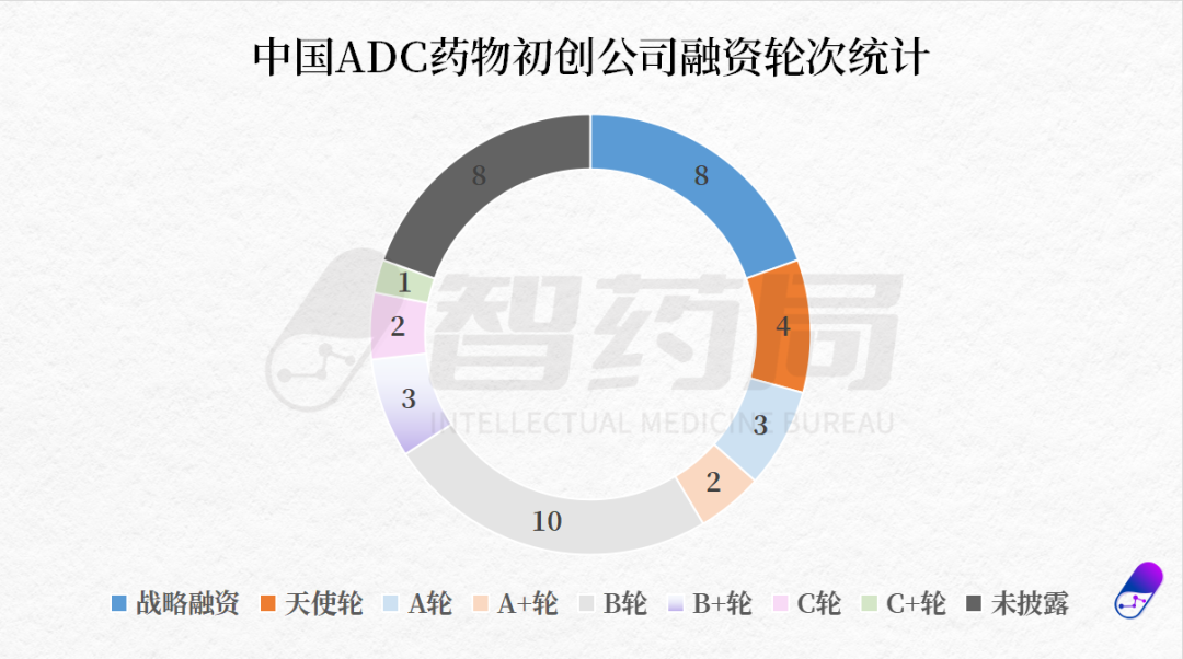 从融资轮次中可以得出,中国ADC药物企业整体处于早期发展阶段,也就是说绝大多数企业仍然处于天使轮、A轮、A+轮、B轮阶段,甚至还有许多企业并未获投,共占公司总数量约 70%。