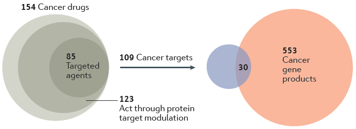 以肿瘤药为例,2017年发表在NRD的一篇综述做过这样一项分析。在FDA批准的154款抗肿瘤药物(包括细胞毒类药物)中,总共涉及了109个靶点。现有肿瘤基因表达产物,大概有553个。尽管如此,这两项的交集只有区区30个。这意味着在已知的肿瘤基因相关产物中,近95%并没有被开发成药。数字之大,有点令人意外,而这还仅仅只是已知的肿瘤基因产物。
