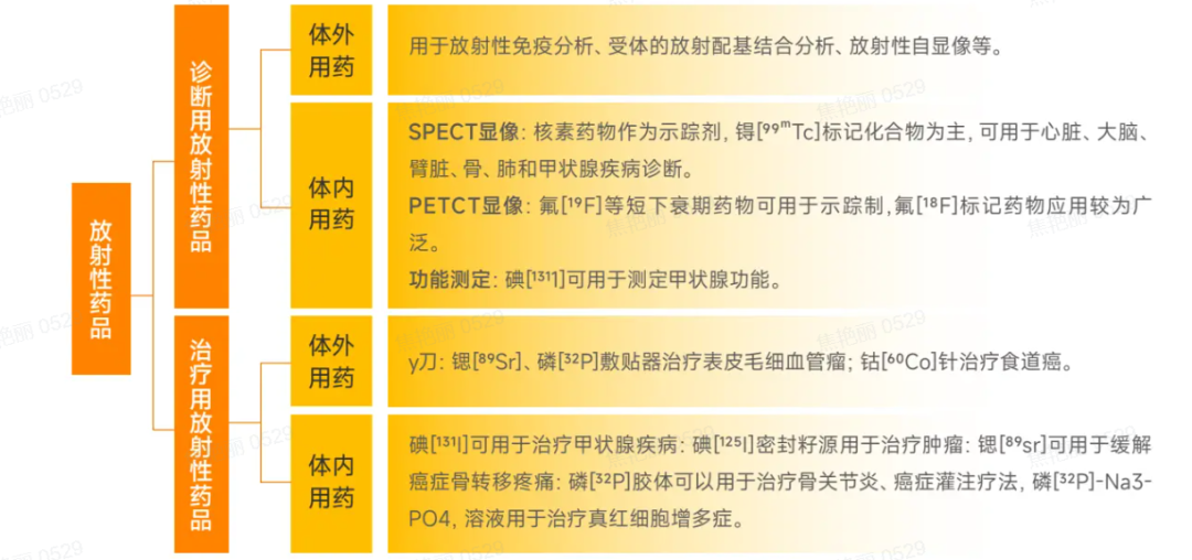 按照临床核医学的用途,核药可分为体内核药与体外核药两类。体外核药主要指放射性同位素标记的免疫诊断试剂,体内核药可按具体用途分为诊断用核药与治疗用核药。