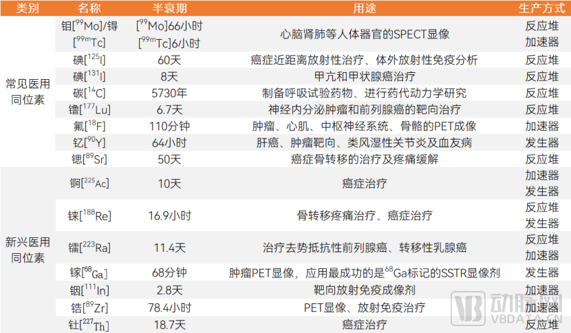 常用医用同位素、新兴医用同位素概况