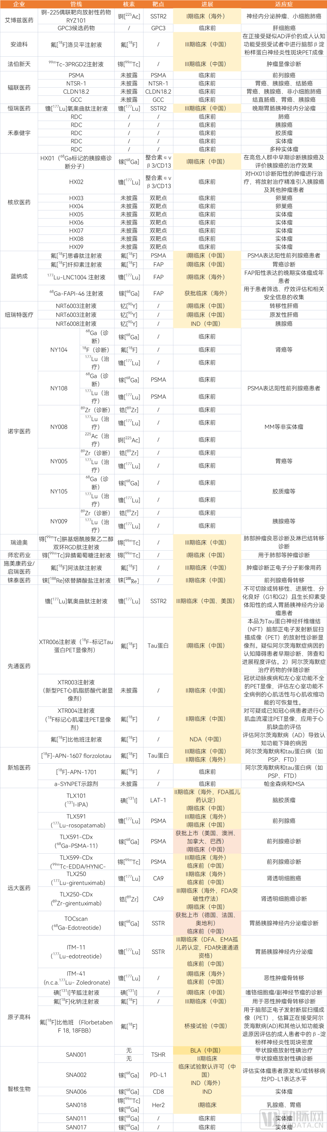 (2)全球核药研发繁荣,镥[177Lu]热度极高,存在一定靶点、适应症同质化现象