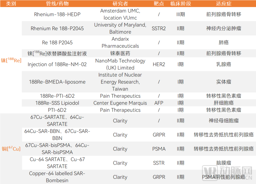 处于临床阶段的铜[67Cu]、铼[188Re]标记药物