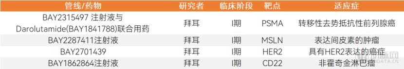拜耳是布局钍[227Th]核药的主要企业。目前进入临床阶段的钍[227Th]核药管线均属于拜耳。拜耳正在开发钍偶联靶向(TTC)研究平台,并依托此平台开发针对多种癌症的药物,包括PSMA阳性的前列腺癌、表达间皮素的肿瘤、HER2阳性的肿瘤、非霍奇金淋巴瘤。其中,拜耳正在探索将BAY2315497注射液与Darolutamide(BAY1841788)联合用药,治疗转移性去势抵抗性前列腺癌,该研究正处于临床Ⅰ期。