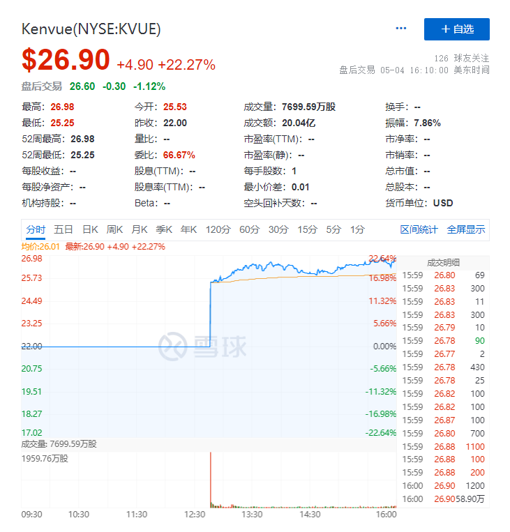 上市首日,Kenvue股价大涨22.27%。