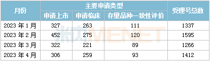 据米内网中国申报进度(MED)数据库统计,2023年4月CDE共承办药品注册申请1412件。其中上市申请306件,临床申请259件,存量品种一致性评价93件。