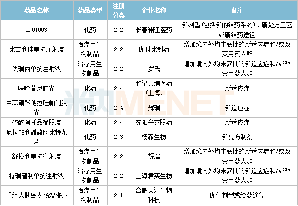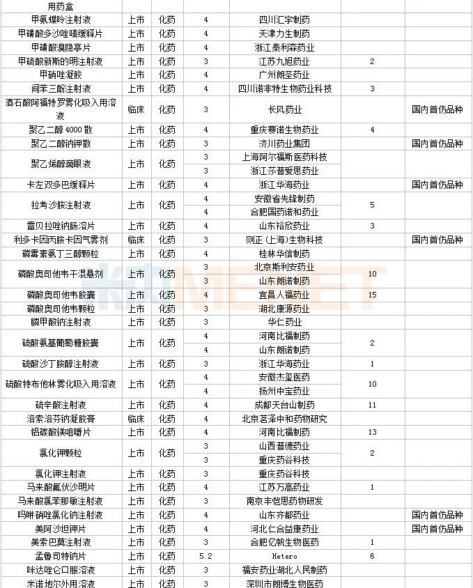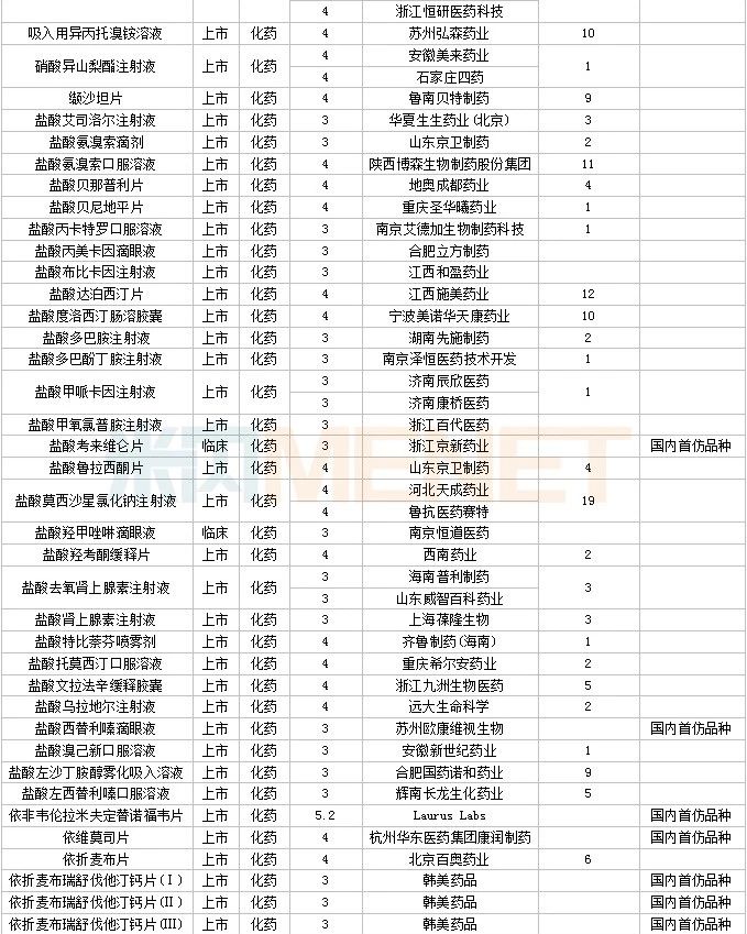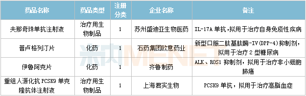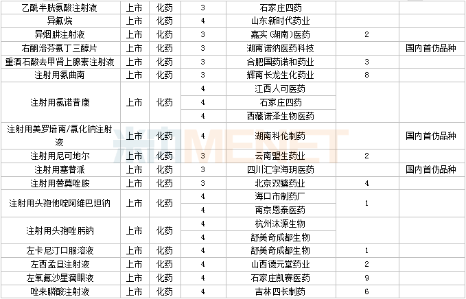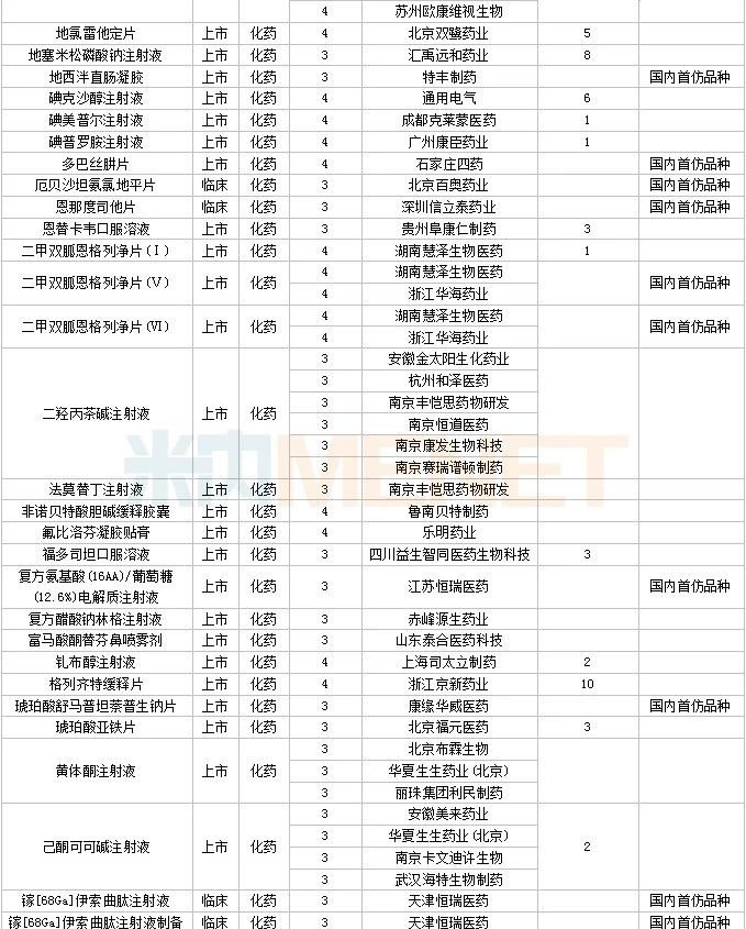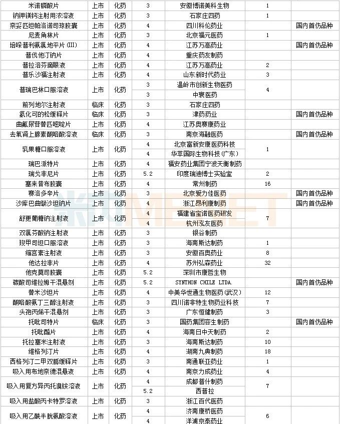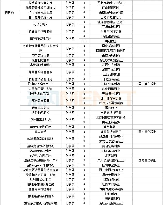 60个仿制药获批,其中奥美拉唑碳酸氢钠胶囊(Ⅱ)(北京百奥药业)、屈螺酮炔雌醇片(Ⅱ)(浙江仙琚制药)、溴夫定片(湖南华纳大药厂)、盐酸二甲双胍缓释片(Ⅳ)(广州玻思韬控释药业)为国内首仿品种。