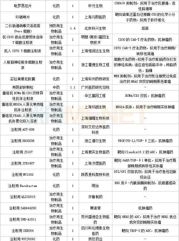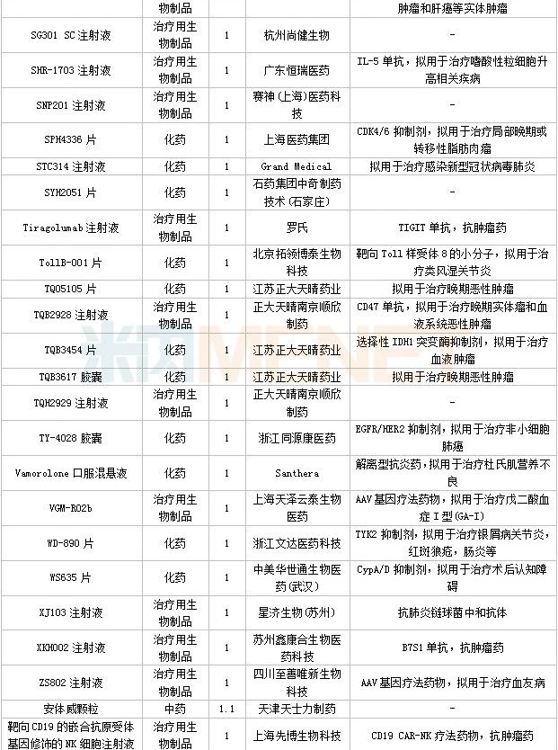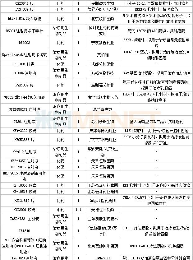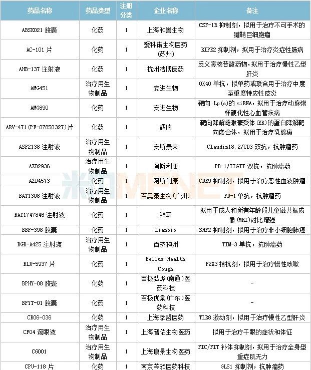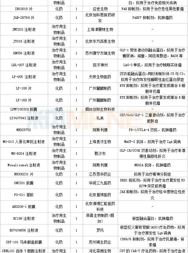 数据来源:米内网中国申报进度数据库(MED)、CDE、NMPA;相关统计字段按药品名称统计,时间截至2023年4月30日;获批品种按NMPA发布时间统计;药物作用靶点以及适应症整理自公开资料。