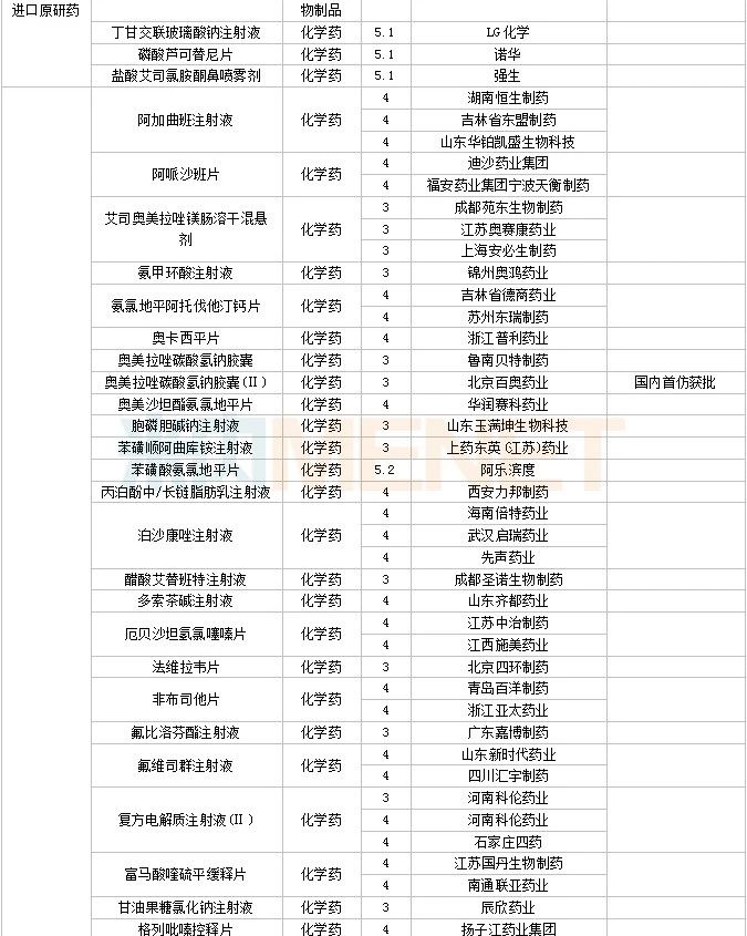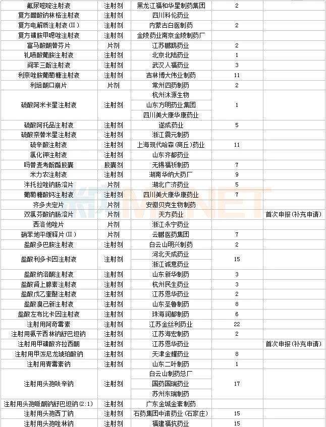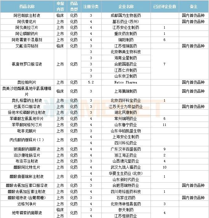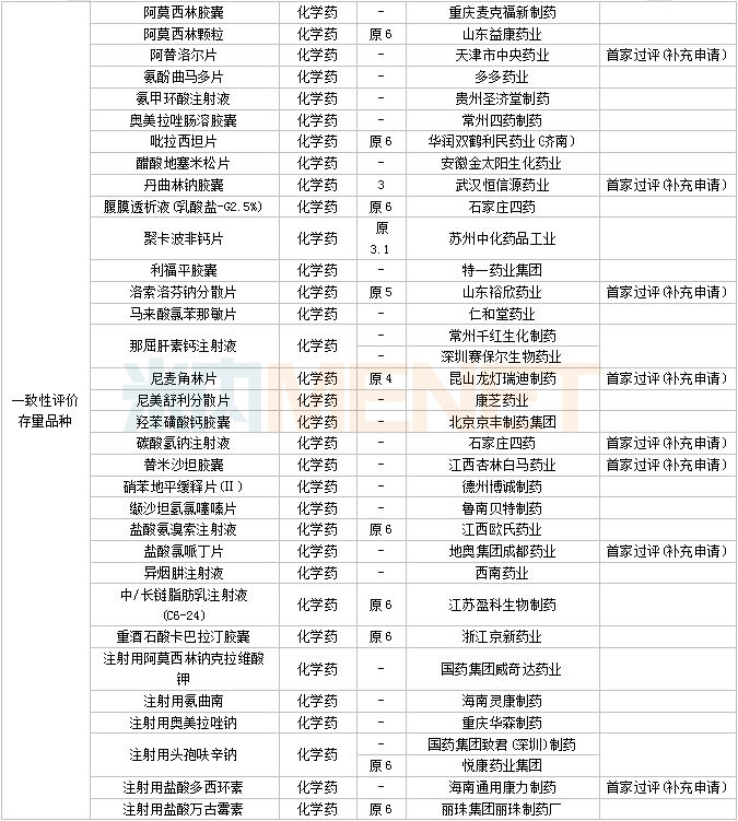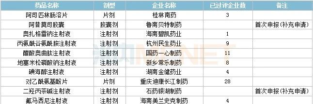33个存量品种有企业过评,其中阿替洛尔片(天津市中央药业)、丹曲林钠胶囊(武汉恒信源药业)、洛索洛芬钠分散片(山东裕欣药业)、尼麦角林片(昆山龙灯瑞迪制药)、碳酸氢钠注射液(石家庄四药)、替米沙坦胶囊(江西杏林白马药业)、盐酸氯哌丁片(地奥集团成都药业)、注射用盐酸多西环素(海南通用康力制药)为首家过评。