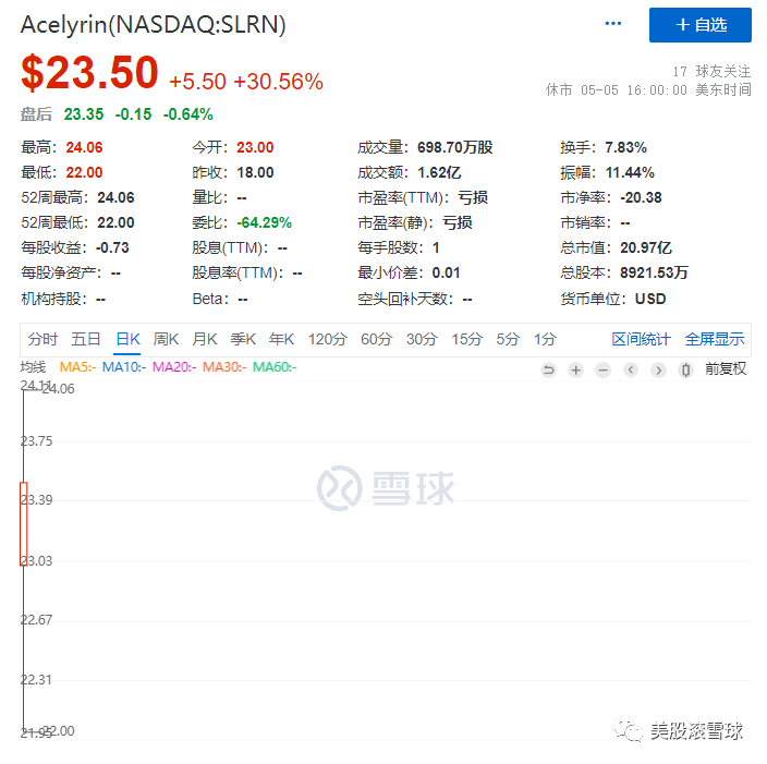 上市后,公司股价首日暴涨30.56%。无论是定价、发行规模,还是首日涨幅,均显示出市场对公司的高度热情,Acelyrin一定程度上带动了生物医药行业的回暖,同日生物医药科技指数(ARCA:XBI)大涨1.65%。
