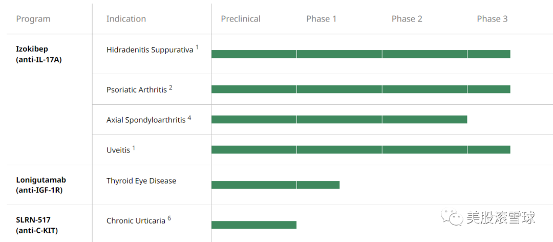 与大多数药企引进早期管线不同的是,Acelyrin公司的管线以后期为主,且均集中于自身免疫系统疾病领域,其中: