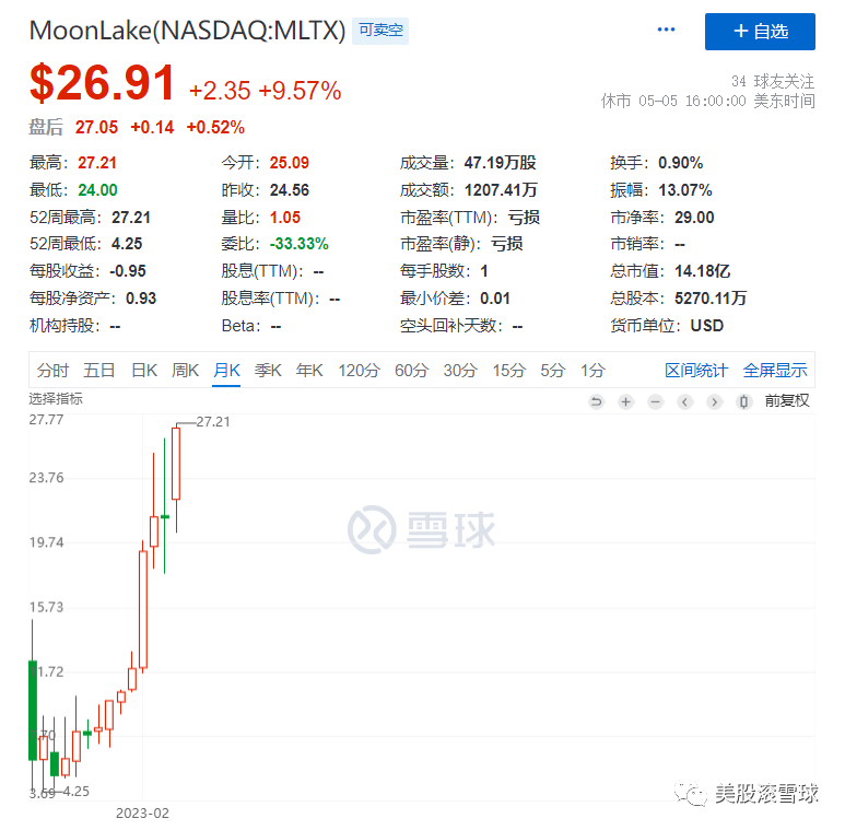 2022年4月,以合并SPAC上市的MoonLake(NASDAQ:MLTX),其主打药物Sonelokimab是靶向IL-17的三抗药物,具有挑战Cosentyx的潜力,吸引了BVF、Cormorant、RTW等知名Biotech投资机构的投资,近一年涨幅达156.29%,是2022年以来表现最好的De-SPAC医药公司。