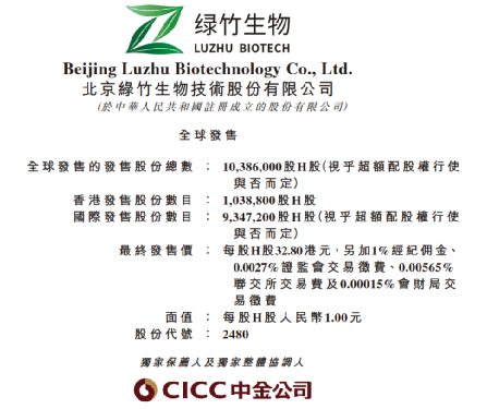 今日,绿竹生物在港交所正式上市,发行价32.8港元/股,共发行1038.6万股,由中金公司独家保荐。
