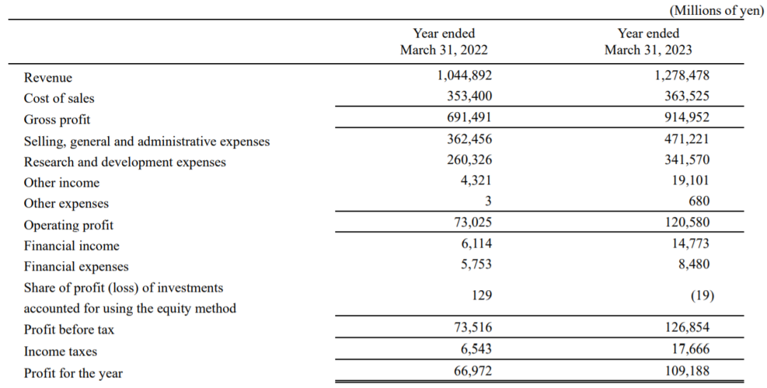 近日,日本制药巨头第一三共公开了2022年全年(2022年4月1日-2023年3月31日)业绩,总营收12785亿日元(约合94.39亿美元),同比增长22.4%。销售费用3491亿日元,几乎与去年持平,毛利水平为72.69%,相较去年同期有明显提升。销售和管理费用支出4701亿日元,同比增长33.5%至总销售额的26.34%。研发投入3367亿日元(约合24.86亿美元),相比去年同期增长了32.5%,研发投入水平升高至销售额的26.34%,在制药巨头中已经属于非常高的水准。第一三共的营业状况数据