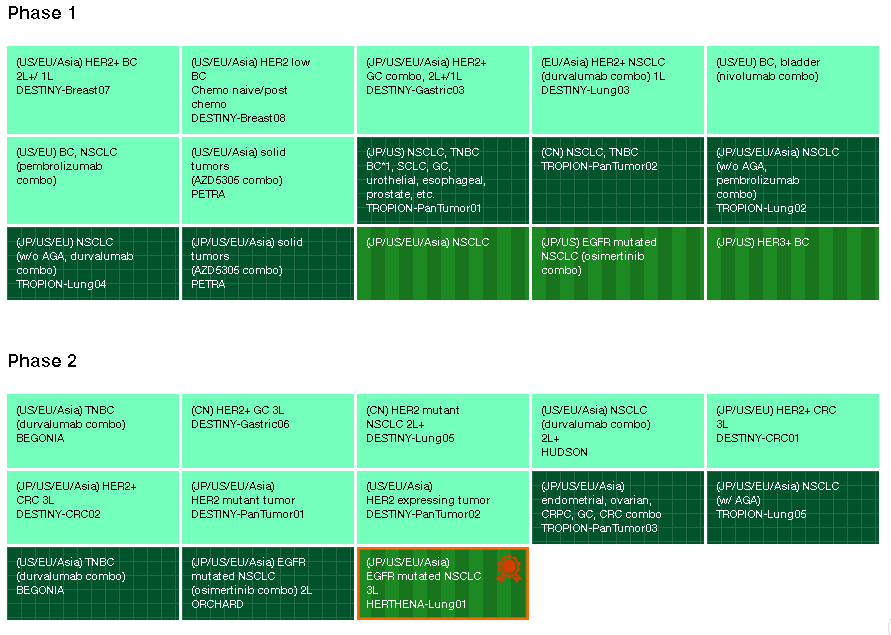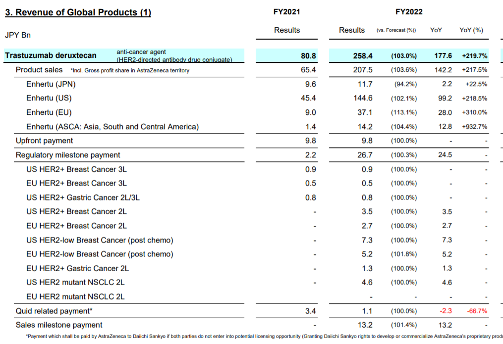 产品管线方面,第一三共有三大全球性产品,其中销售额主要来自Trastuzumab deruxtecan和Edoxaban,分别为2584亿日元(19.07亿美元)和2440亿日元(18.01亿美元),同比分别增长219.7%和18.6%。Datopotamab deruxtecan营收并不理想,仅为71亿日元。除了以上三大产品,该公司销售的均为区域性产品,分为六大业务。