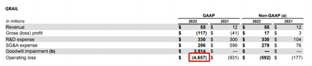 备受市场争议的还是Illumina以80亿美元收购的癌症早筛公司GRAIL,该公司2022年全年营收仅为0.55亿美元,研发投入3.3亿美元,销售、管理费用2.96亿美元,叠加计提了商誉减值39.14亿美元,整体运营亏损达到46.57亿美元。