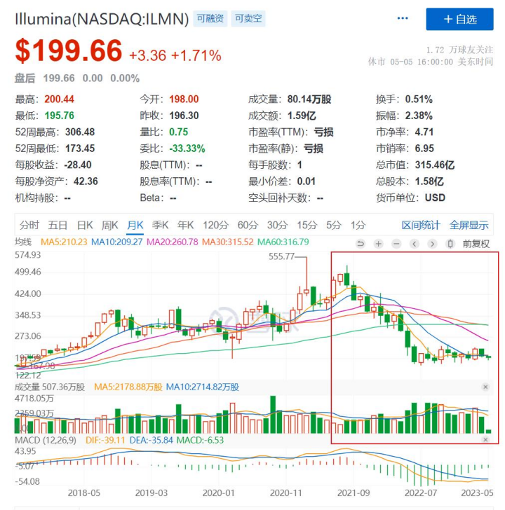 事实上,自2020年年底Illumina宣布收购GRAIL以来,整个2021年和2022年,Illumina公司的股价在短暂上行之后,随即调头一路向下,以最新不足200美元股价计算,相较于早前超过500美元高位已经“蒸发”了超过六成。