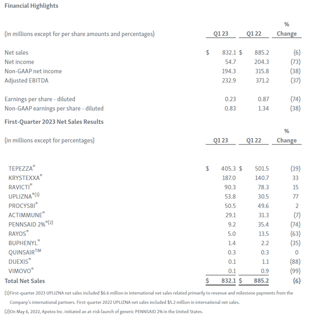 在细分产品方面,财报披露的12款上市产品销售额中,就有7款主要产品出现了不同程度的业绩下滑。其中,Tepezza®作为公司产品销售业绩的主要贡献点,2023年第一季度销量为4.05亿美元,与2022年第四季度环比下降18%。虽然财报中提及销售的下降是为季节性影响,但对比2022年第一季度的约5.02亿美元的产品销售额,业绩同期比也下降了19%。