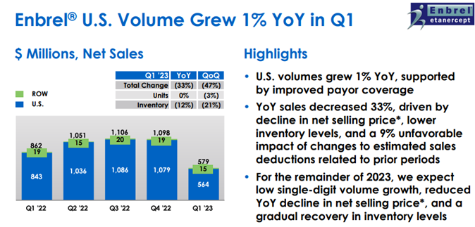 事实上,Enbrel®作为一款已经上市多年的产品在销量上已经开始步入下滑阶段。根据安进2023年第一季度的财报显示,Enbrel®报告期内的销量以跌罗至5.79亿美元,相较于2022年同期的8.62亿美元业绩,全球总销售额减少了2.83亿美元,同期比减少了约33%;相较2022年第四季度的10.98亿的销售业绩,环比减少了约47%。
