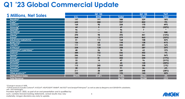 同时,安进自身也承受着一定业绩压力。近期披露的公司财报数据显示,安进2023年第一季度的产品销售额为58.46亿美元,相较2022年同期的57.31亿美元销售额,同期比上升2%;但第一季度的营业额为61.05亿美元,相较2022年同期的62.38亿美元的营收,同期比反而降低了2%。
