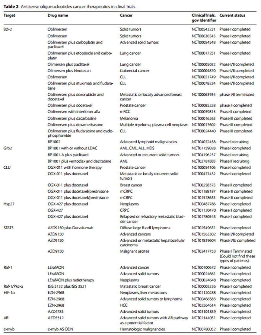 寡核苷酸是由10-50个核苷酸组成的药物,包括ASOs、siRNA和microRNAs (miRNAs)。寡核苷酸可以通过与特定的DNA或RNA序列或蛋白质结合并干扰靶基因表达来治疗疾病。它们可以调节转录后水平,并有望靶向难以直接靶向的特殊靶点。因此,寡核苷酸被认为是继小分子药物和抗体之后的第三大类型药物。目前,ASOs、siRNAs和miRNAs是研究最广泛的治疗恶性肿瘤的寡核苷酸药物。