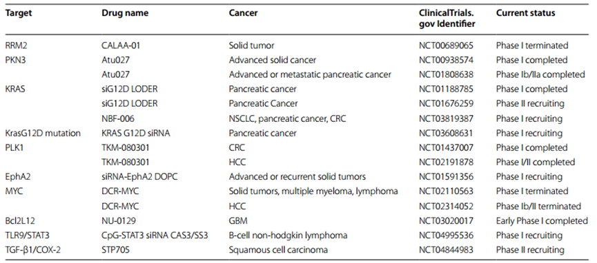 另一种siRNA药物是Atu027,它被包裹在脂质纳米颗粒(LNP)中, 可以特异性靶向致癌靶点PKN3。临床试验结果表明,Atu027在晚期或转移性胰腺腺癌患者联合标准化疗药物吉西他滨(NCT00938574)时具有良好的安全性和活性。