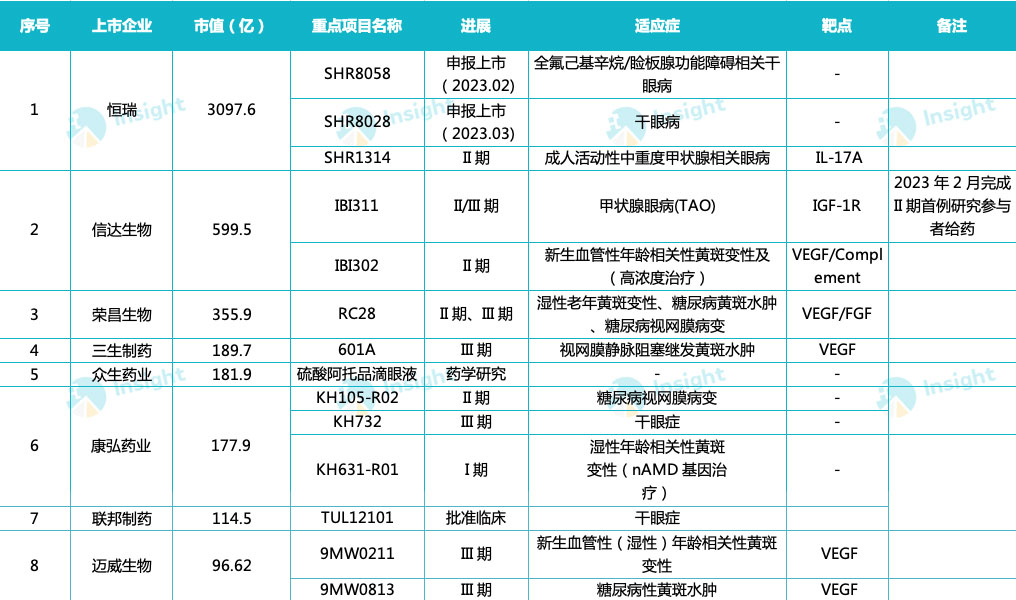 综合性药企中眼科管线商业化处于萌芽期,如恒瑞制药在十一大重点领域中,眼科排名第十,前期落地药品地夸磷索钠滴眼液(一款治疗干眼症药物),于 2022 年 5 月 25 日获批上市,目前在北京地区的医院中只有原研药物参天制药丽爱思在售。另一类综合药企眼科管线还处在研发阶段,如三生制药、荣昌生物、信达生物。