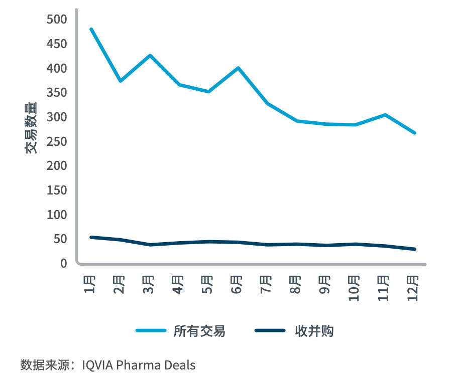 在2022年签署的交易中,由于COVID-19相关的交易活动与去年相比减少了一半以上,导致只有不到10%的交易涉及COVID-19。按照惯例,2022年第一季度的交易量最高,随着当年的进展稳步放缓(图2)。收并购活动变得更为稳定:交易量在1月份达到峰值,在年中进入平稳期,然后在12月降至最低。
