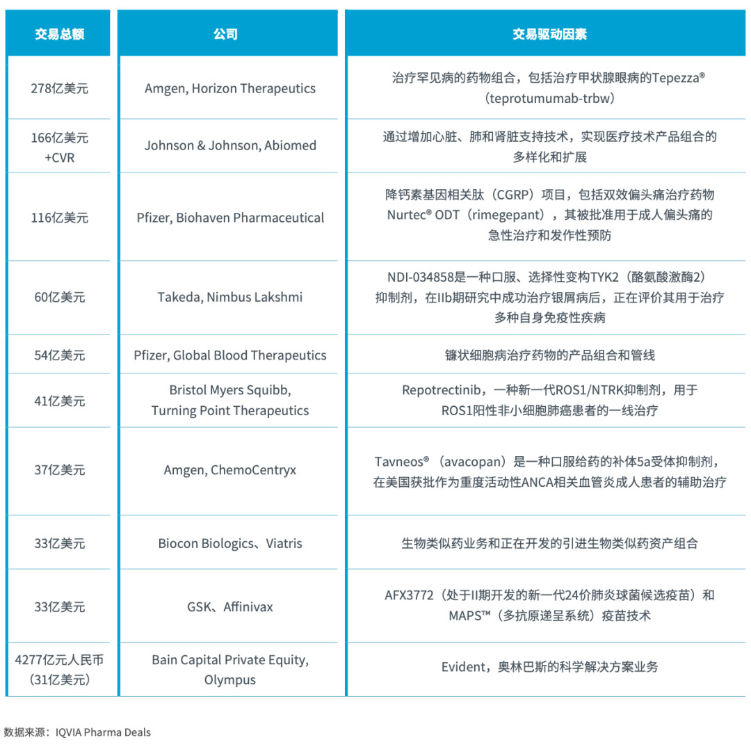 2022年最大的收并购交易是安进以278亿美元现金收购Horizon Therapeutics,该交易将加强安进的产品组合,补强了其罕见病特许经营权。