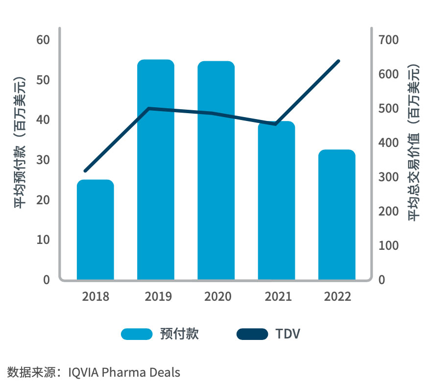 图5:2018-2022年许可交易的平均总交易价和平均预付款