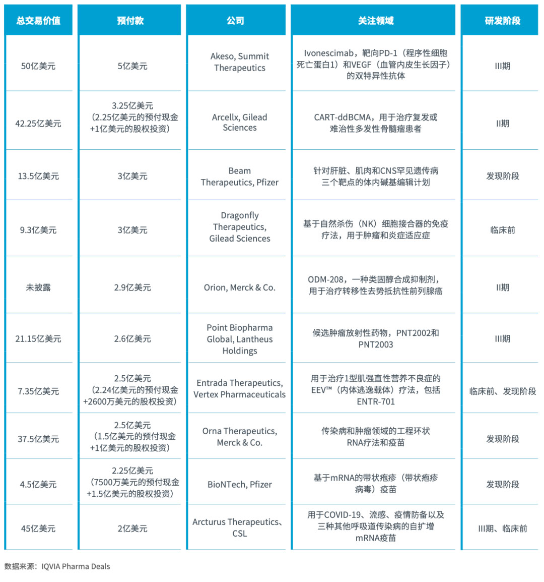 位列榜首的合作交易中,Summit Therapeutics 同意向康方生物支付5 亿美元的预付款,以获得其III 期抗PD-1/VEGF(抗程序性细胞死亡蛋白1/ 血管内皮生长因子)双特异性抗体ivonescimab 在美国、加拿大、欧洲和日本的独家经营权,这笔金额超过了宣布交易之前该公司市值的三倍,并可能达到50亿美元。