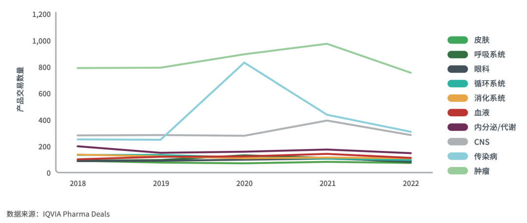 图6:按治疗领域划分的产品交易数量,2018-2022