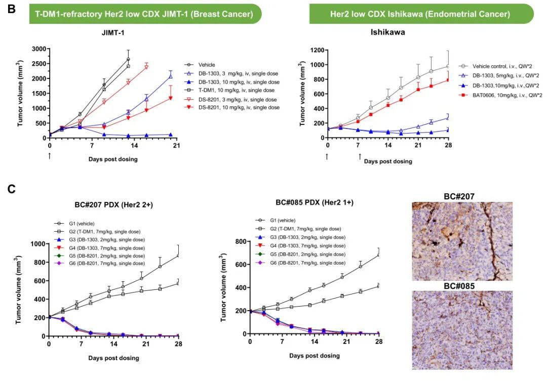 B) DB-1303在CDX异种移植模型中的抗肿瘤效果;C) DB-1303在两个Her2低表达 PDX异种移植模型中的抗肿瘤效果